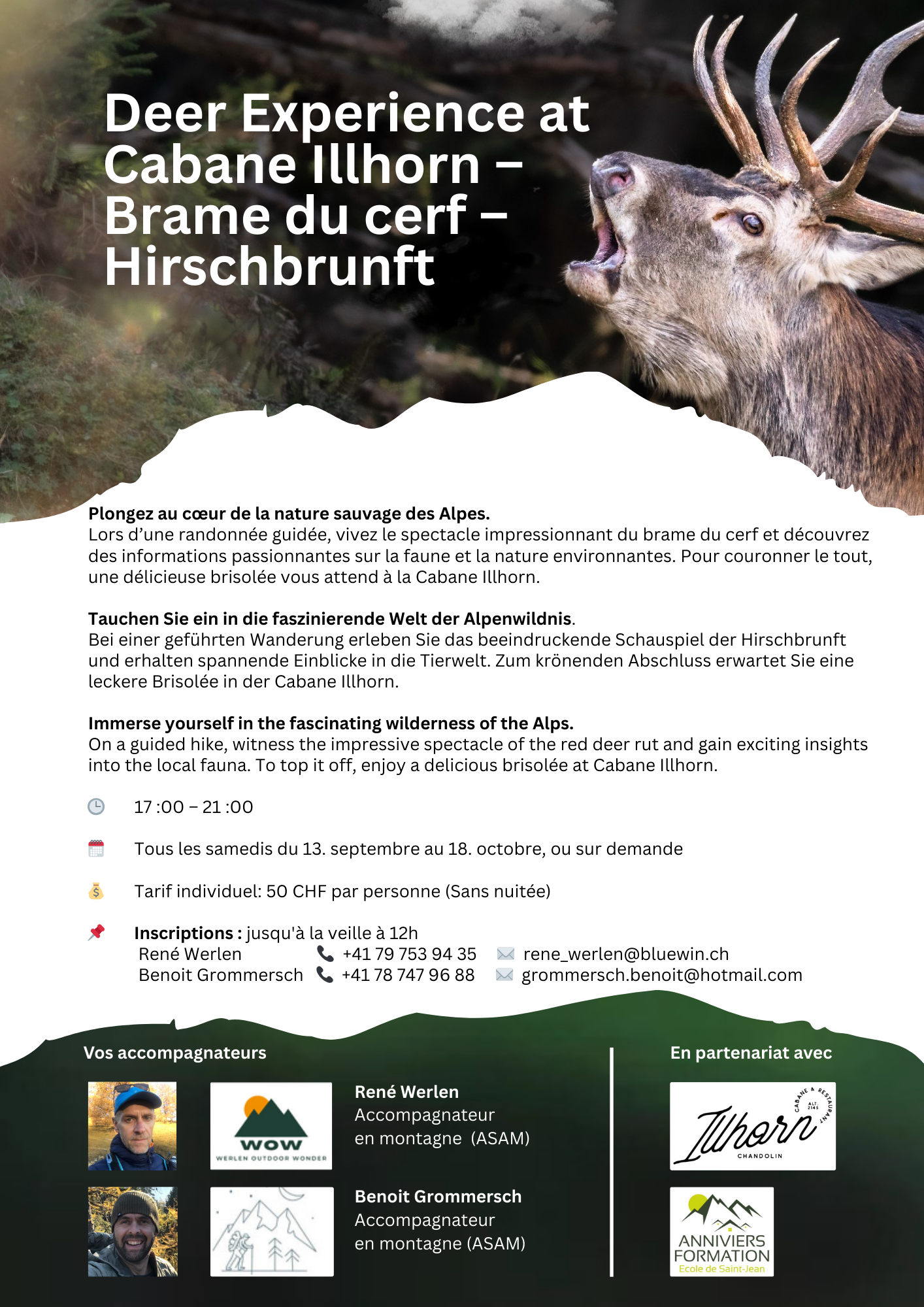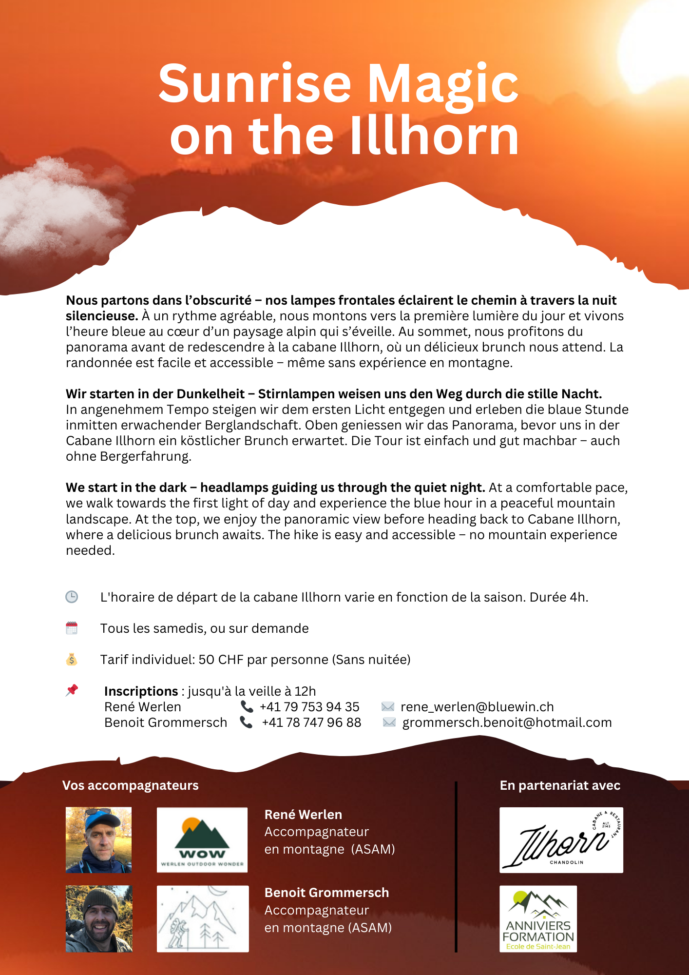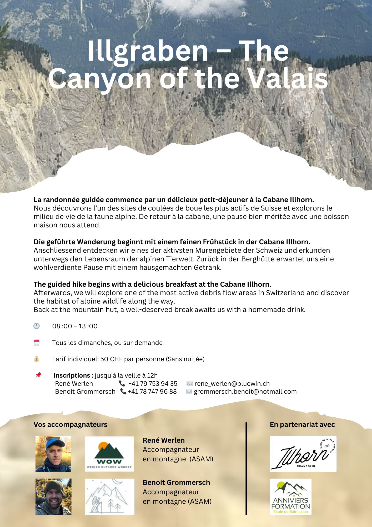 Découvrez, ci-après, l'offre actuelle de randonnées, organisées en collaboration avec René Werlen, accompagnateur en randonnée, et le restaurant de montagne